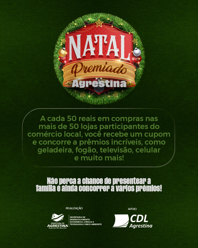 A Prefeitura de Agrestina, por meio da secretaria de Desenvolvimento Econômico, Ciência e Tecnologia e Meio Ambiente, em parceria com a Câmara de Dirigentes Lojistas (CDL), está promovendo a primeira edição do Natal Premiado, campanha que reforça a importância de comprar no comércio local e valorizar os empreendedores da cidade durante o período natalino.