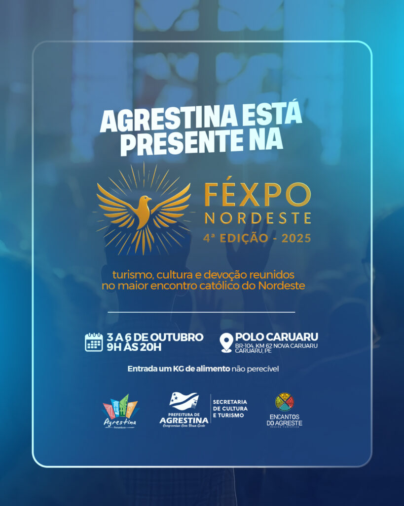 A Prefeitura de Agrestina, por meio da Secretaria de Cultura e Turismo, estará presente na IV edição da Fexpo – Feira de Experiências da Fé Católica, que acontece de 03 a 06 de outubro de 2025, no Polo Caruaru. O município participará com um stand que evidencia sua tradição no turismo religioso, destacando a devoção a Nossa Senhora do Desterro, padroeira da cidade, cuja festa é considerada a maior celebração dedicada à santa no Brasil.