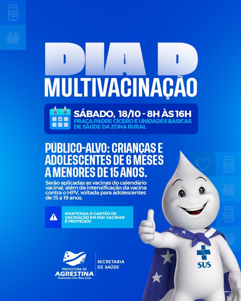 A Prefeitura de Agrestina, por meio da Secretaria de Saúde, promove neste sábado (18), o Dia D da Campanha de Multivacinação. A ação tem como objetivo atualizar a carteira de vacinação de crianças e adolescentes de 6 meses a menores de 15 anos, garantindo acesso a todas as vacinas previstas no Calendário Nacional de Vacinação 2025.