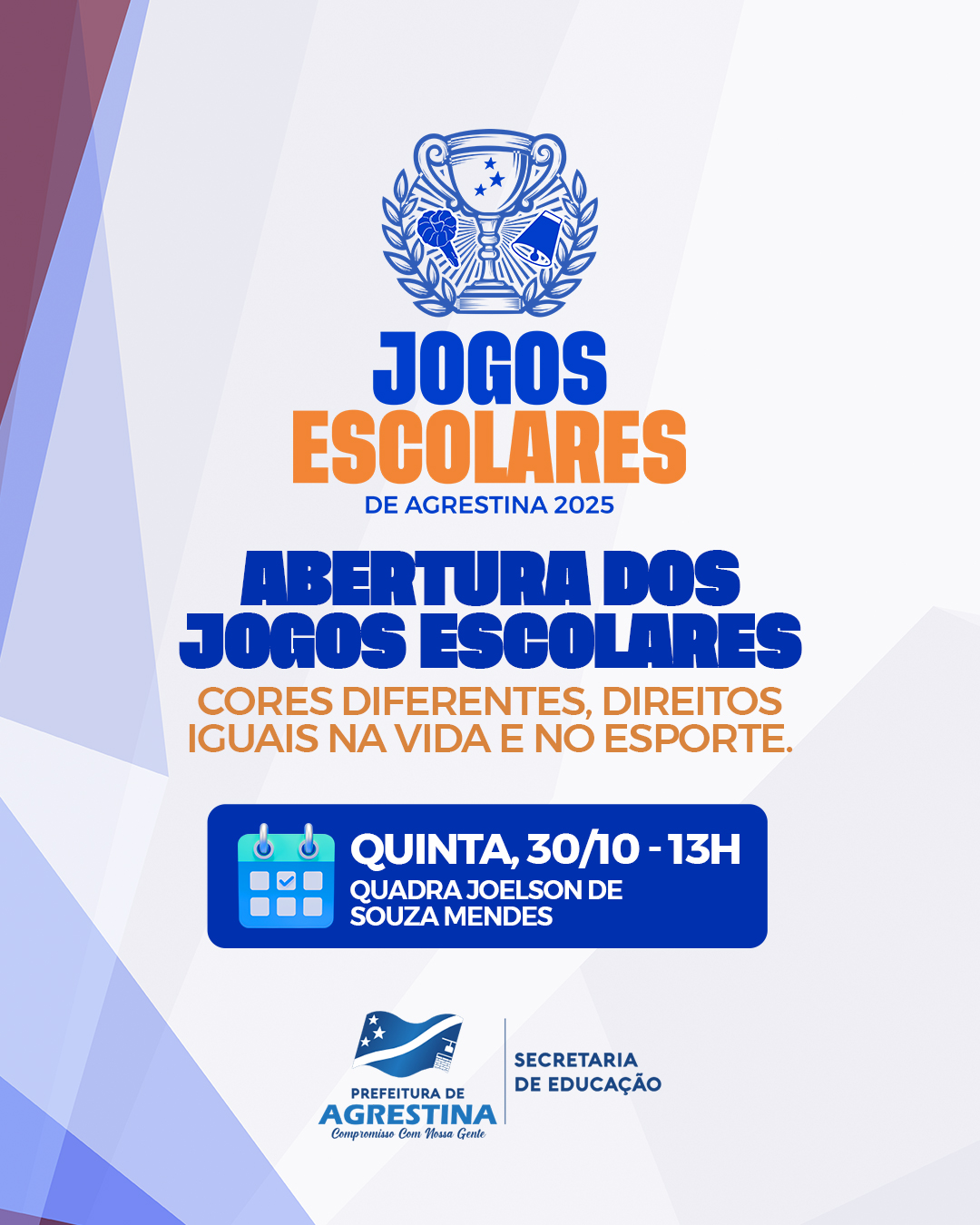 Destaques Educação NotíciasAgrestina realiza abertura oficial dos Jogos Escolares 2025 nesta quinta-feira (30) Destaques, Educação, Notícias / Agrestina Prefeitura / outubro 30, 2025