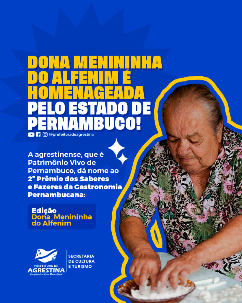 A cultura agrestinense ganha mais um importante reconhecimento. A mestra doceira Dona Menininha do Alfenim, Patrimônio Vivo de Pernambuco, foi escolhida para dar nome à segunda edição do Prêmio dos Saberes e Fazeres da Gastronomia Pernambucana, que nesta edição recebe o título especial de Edição Dona Menininha do Alfenim.