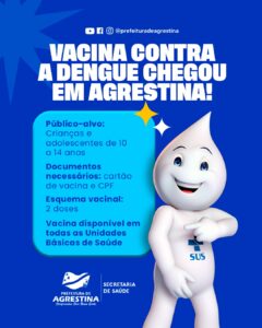 A Prefeitura de Agrestina, por meio da Secretaria Municipal de Saúde, iniciou a vacinação contra a dengue no município, com foco em crianças e adolescentes de 10 a 14 anos. A imunização está disponível em todas as Unidades Básicas de Saúde. Para receber a vacina, é necessário apresentar o cartão de vacinação e o CPF. O esquema vacinal é composto por duas doses, conforme orientação do Ministério da Saúde. A ação faz parte das estratégias de fortalecimento da prevenção e do cuidado com a saúde da população, especialmente diante do aumento dos casos de arboviroses em todo o país. De acordo com a secretária municipal de Saúde, Priscylla Wanessa, a vacinação é uma importante aliada no enfrentamento da doença. “A vacina contra a dengue representa um avanço importante para a proteção dos nossos adolescentes. É fundamental que pais e responsáveis levem seus filhos às unidades de saúde, garantindo esse cuidado agora para evitar complicações no futuro. A prevenção continua sendo o nosso principal compromisso com a população de Agrestina”, destacou a secretária. Informações à imprensaScarlett Lima – DECOM/PMA