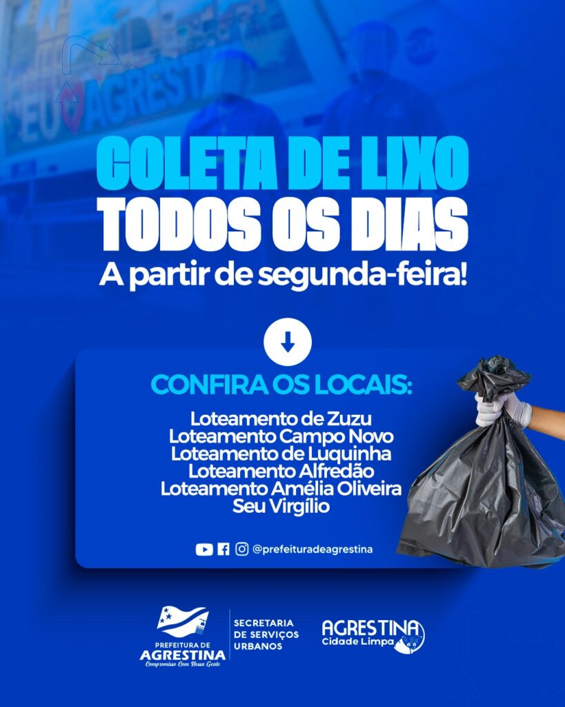 A partir desta segunda-feira (10), a coleta de lixo em Agrestina passará a ser realizada todos os dias em seis localidades do município. A medida, anunciada pela Prefeitura de Agrestina, por meio da Secretaria de Serviços Urbanos, tem como objetivo melhorar a limpeza urbana e garantir mais qualidade de vida à população.