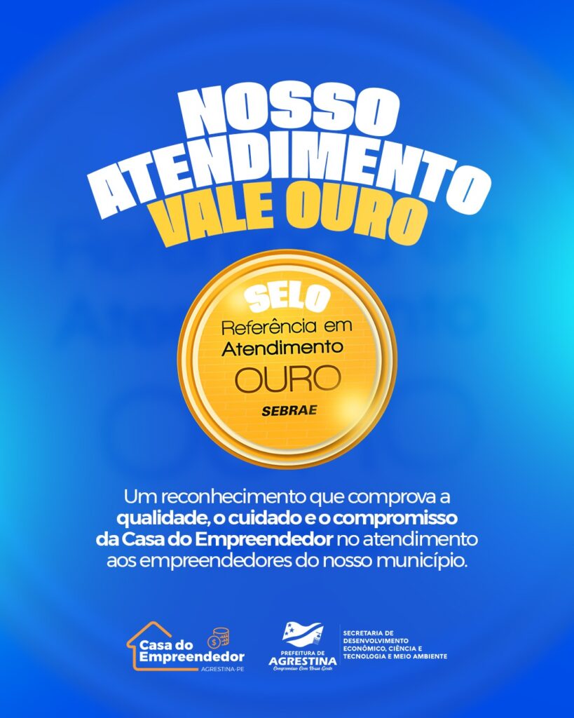 A Prefeitura de Agrestina, por meio da secretaria de Desenvolvimento Econômico, Ciência e Tecnologia E Meio Ambiente em parceria com a Casa do Empreendedor, conquistou o Selo Sebrae de Referência em Atendimento, categoria Ouro 2025, reconhecimento concedido às unidades que se destacam pela qualidade, eficiência e excelência no atendimento aos microempreendedores individuais, microempresas e pequenos negócios.