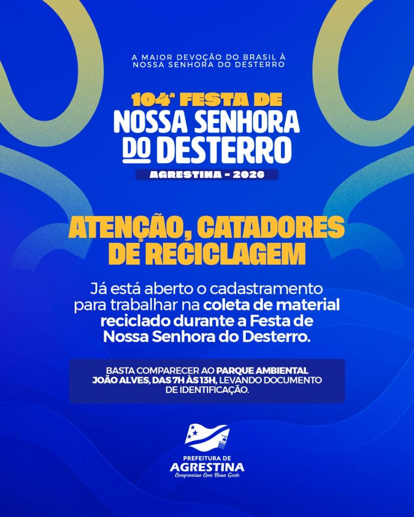 A Prefeitura de Agrestina, por meio da Secretaria de Desenvolvimento Econômico, Ciência e Tecnologia e Meio Ambiente, está realizando o cadastro de catadores de materiais recicláveis interessados em atuar durante a 104ª Festa de Nossa Senhora do Desterro, que acontece nos dias 1 e 2 de fevereiro.