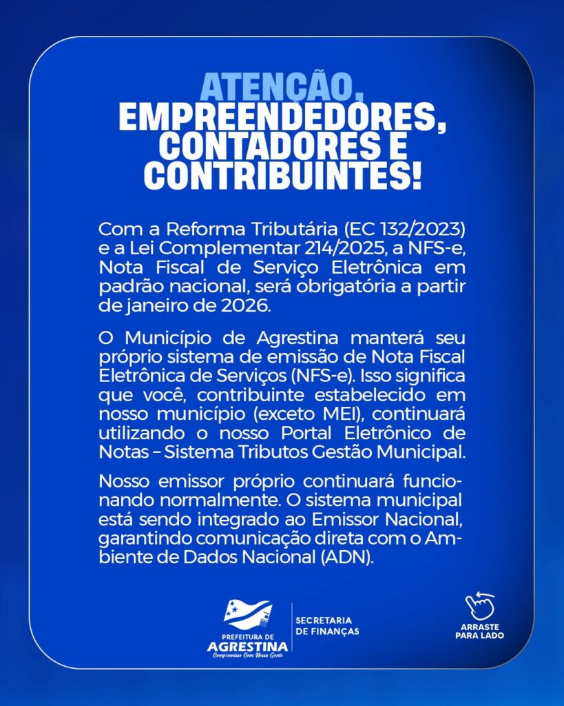 A Prefeitura de Agrestina, por meio da Diretoria de Tributação, reforça que novas orientações e atualizações serão divulgadas ao longo do processo de adaptação, garantindo que todos os contribuintes estejam informados e preparados para as mudanças que entram em vigor em 2026.