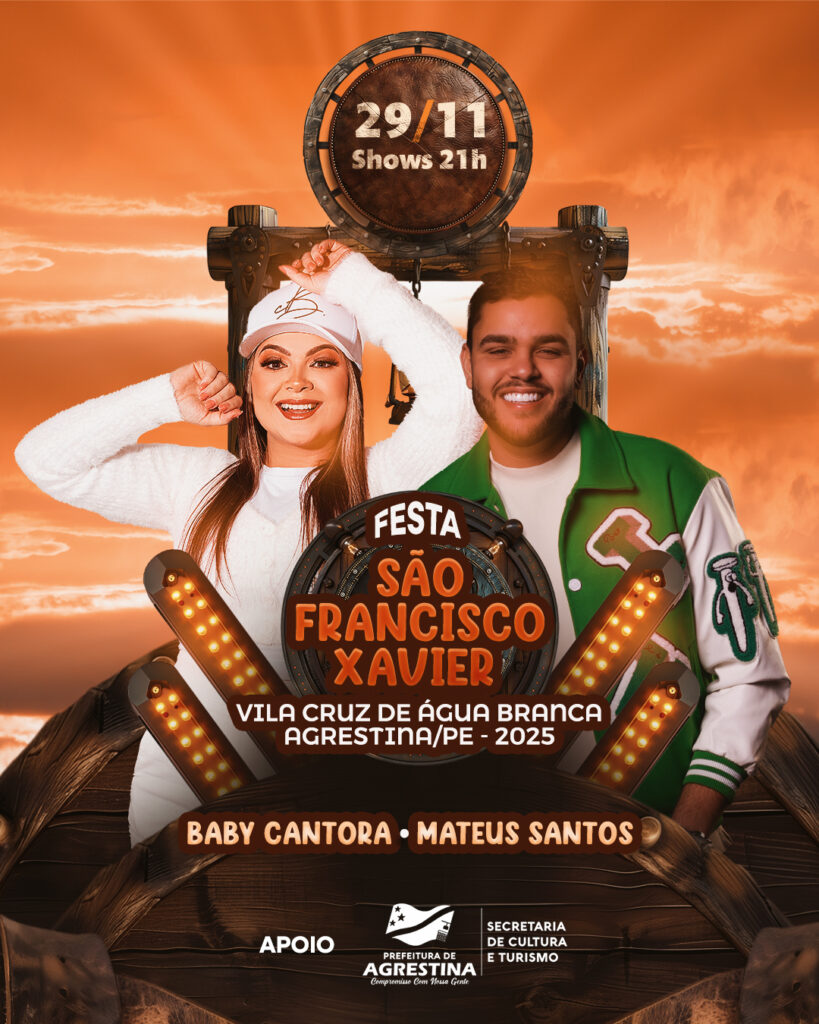 Os shows ficam por conta de Baby Cantora e Mateus Santos, que irão animar o público com repertórios voltados ao forró e outros ritmos que fazem parte da identidade cultural da região. A festa mantém viva uma tradição que atravessa gerações e reforça o sentimento de pertencimento dos moradores da Vila Cruz de Água Branca.